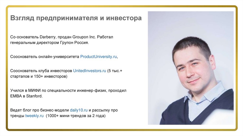 Взгляд предпринимателя и инвестораСо-основатель Darberry, продан Groupon Inc. Работал