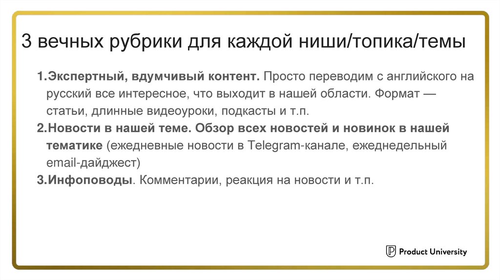 3 вечных рубрики для каждой ниши/топика/темы1.Экспертный, вдумчивый контент. Просто переводим с английского на