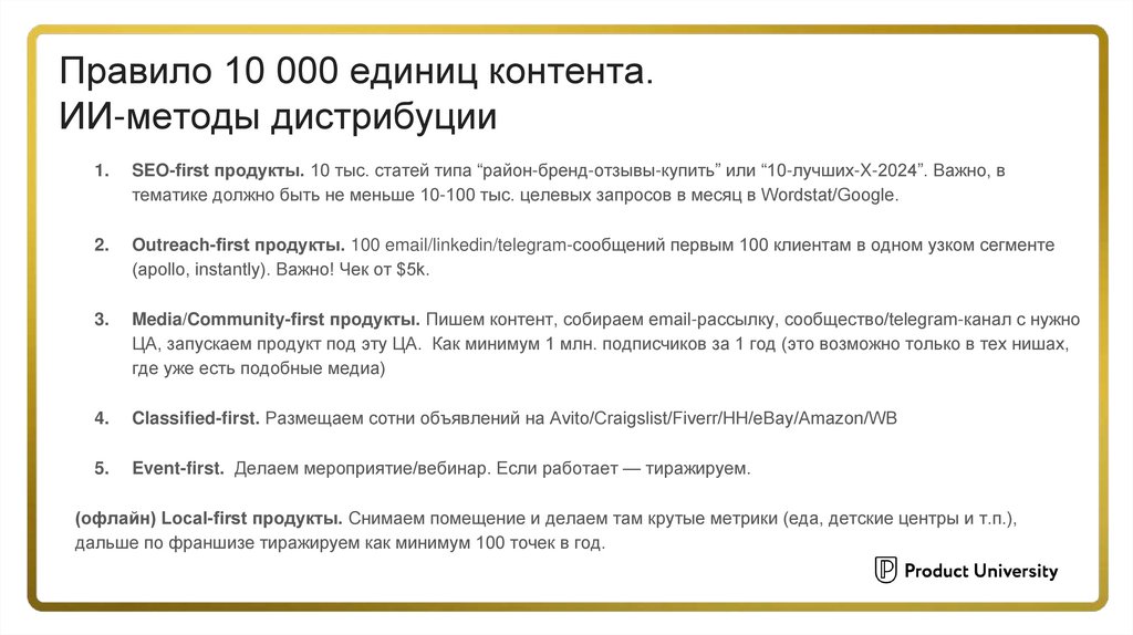 SEO-first продукты. 10 тыс. статей типа “район-бренд-отзывы-купить” или “10-лучших-X-2024”. Важно, в