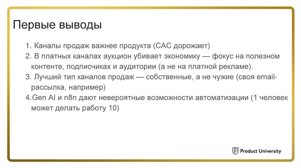 Первые выводы1. Каналы продаж важнее продукта (CAC дорожает)