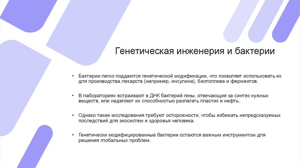 Генетическая инженерия и бактерии• Бактерии легко поддаются генетической модификации, что позволяет использовать их