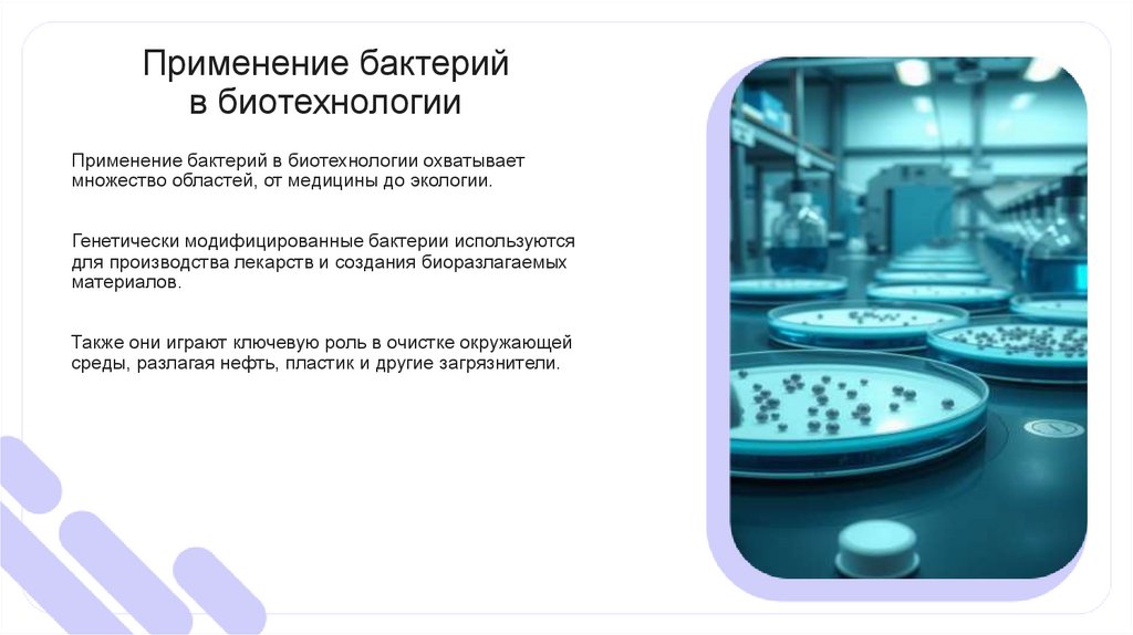 Применение бактерий в биотехнологии охватывает