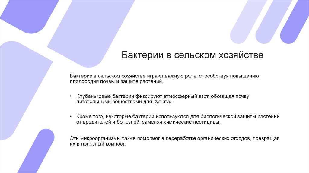 Бактерии в сельском хозяйствеБактерии в сельском хозяйстве играют важную роль, способствуя повышению