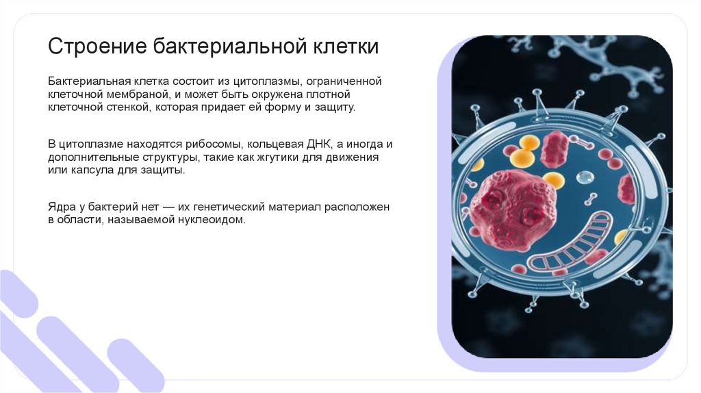 Строение бактериальной клеткиБактериальная клетка состоит из цитоплазмы, ограниченной