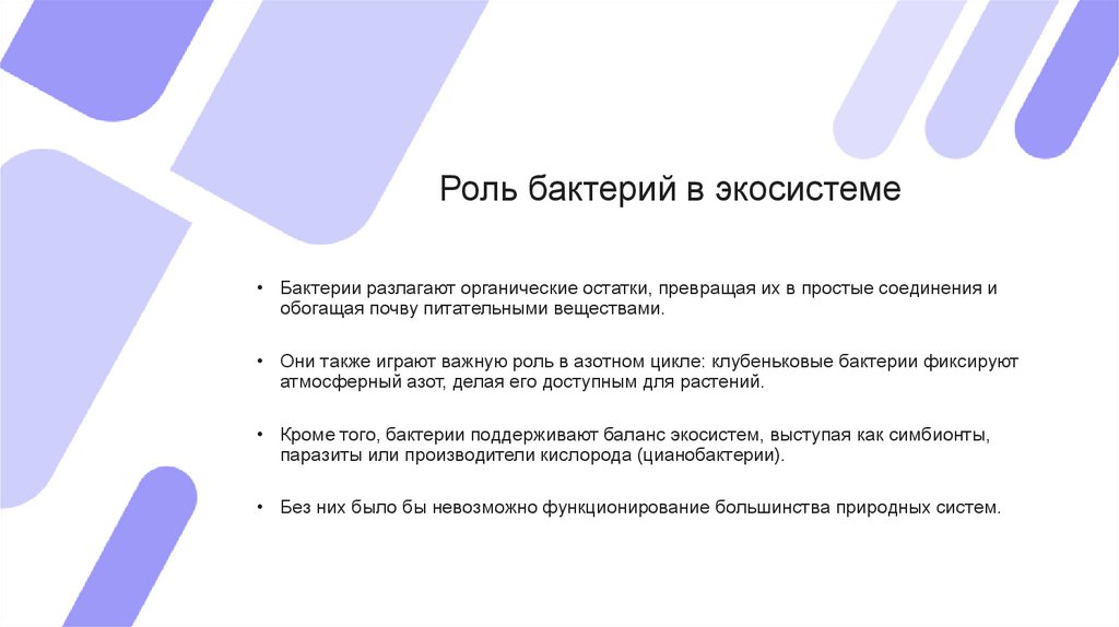 Роль бактерий в экосистеме• Бактерии разлагают органические остатки, превращая их в простые соединения и