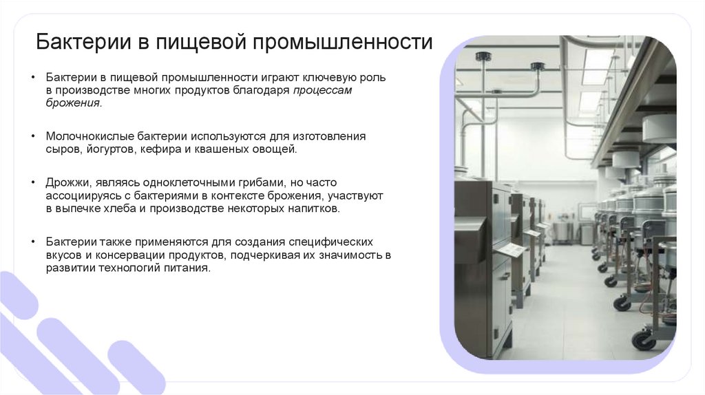 Бактерии в пищевой промышленности• Бактерии в пищевой промышленности играют ключевую роль