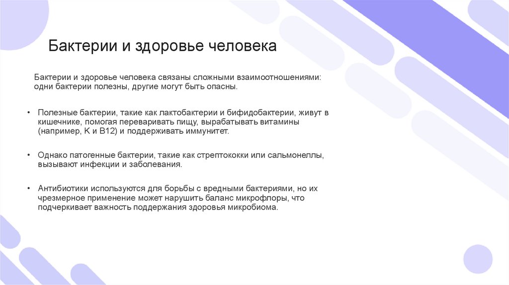 Бактерии и здоровье человекаБактерии и здоровье человека связаны сложными взаимоотношениями: