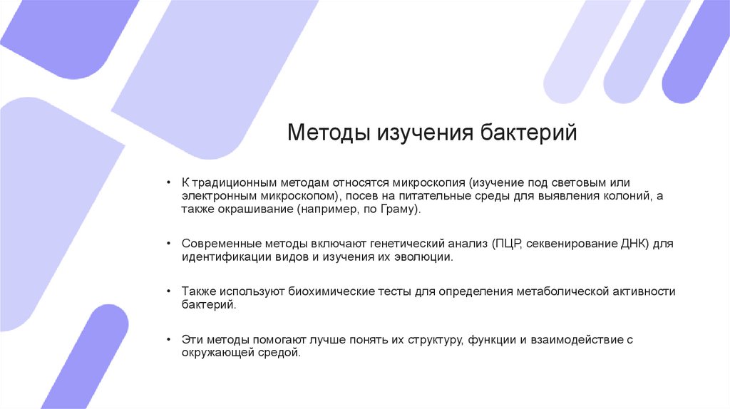 Методы изучения бактерий• К традиционным методам относятся микроскопия (изучение под световым или