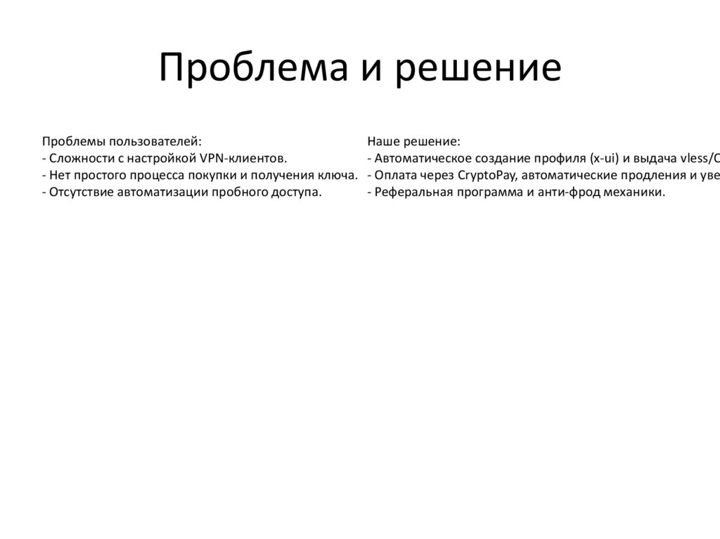 - Нет простого процесса покупки и получения ключа. - Оплата через CryptoPay, автоматические продления и увед