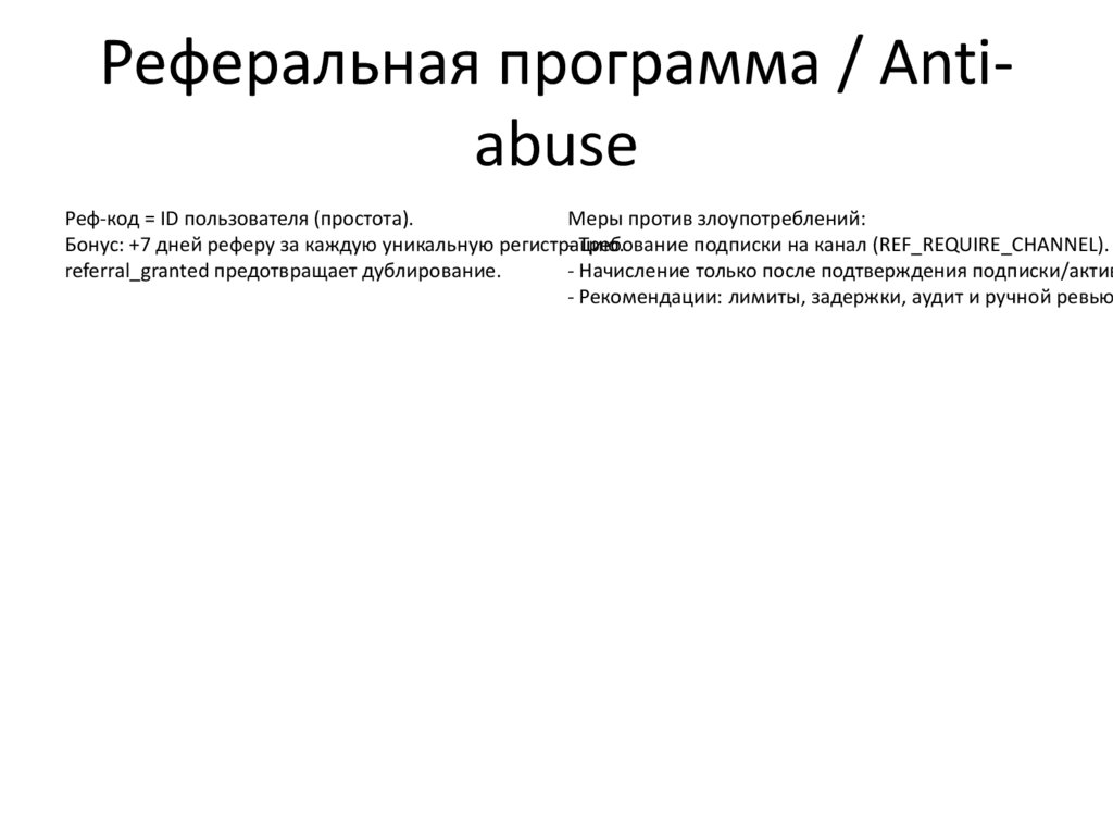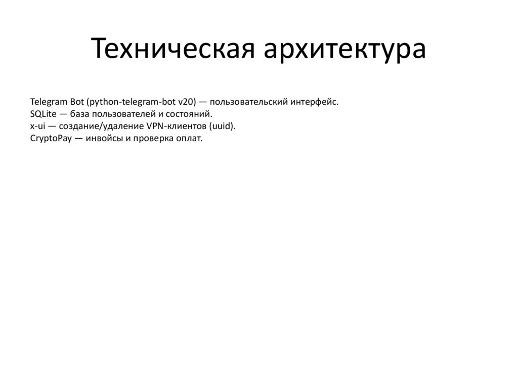 Executive SummaryBEEZONE VPN — Telegram-бот для продажи и управления VPN-доступом.
