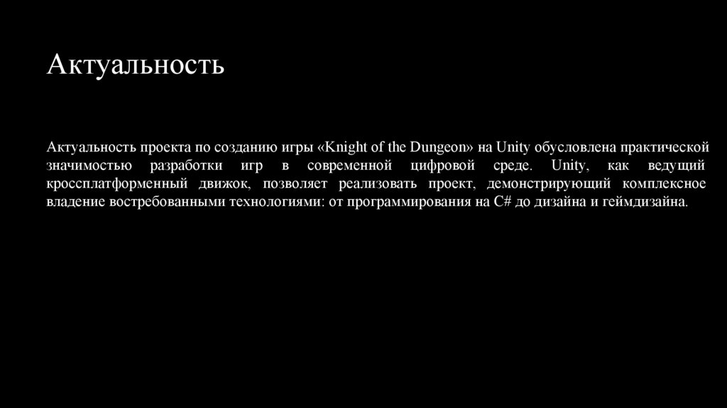 АктуальностьАктуальность проекта по созданию игры «Knight of the Dungeon» на Unity обусловлена практической