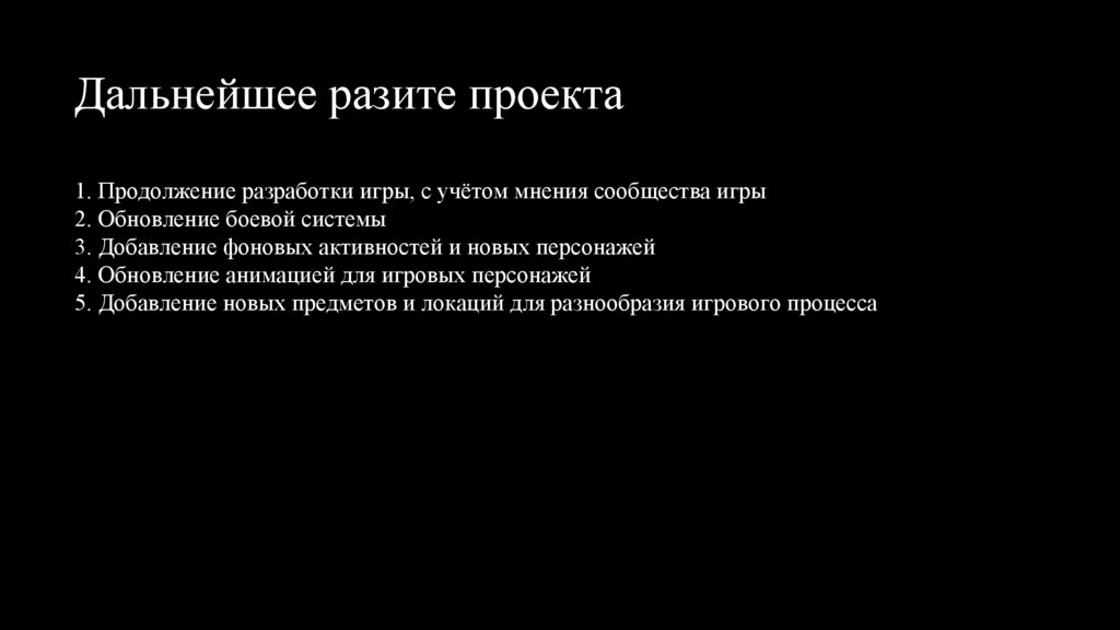 Дальнейшее разите проекта1. Продолжение разработки игры, с учётом мнения сообщества игры