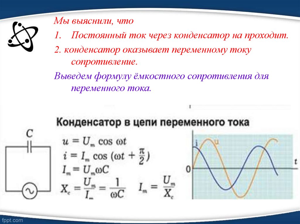 Мы выяснили, что1. Постоянный ток через конденсатор на проходит.