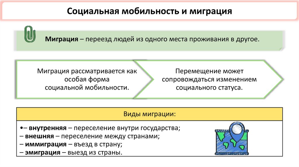 Социальная мобильность и миграцияМиграция – переезд людей из одного места проживания в другое.