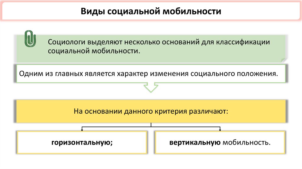 Виды социальной мобильностиСоциологи выделяют несколько оснований для классификации