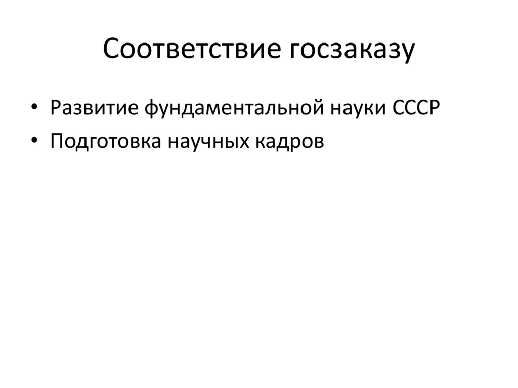 Соответствие госзаказу• Развитие фундаментальной науки СССР