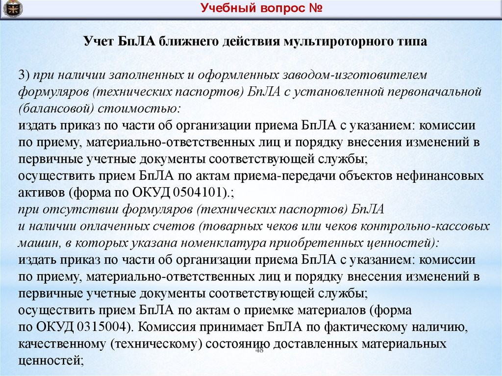 по ОКУД 0315004). Комиссия принимает БпЛА по фактическому наличию,