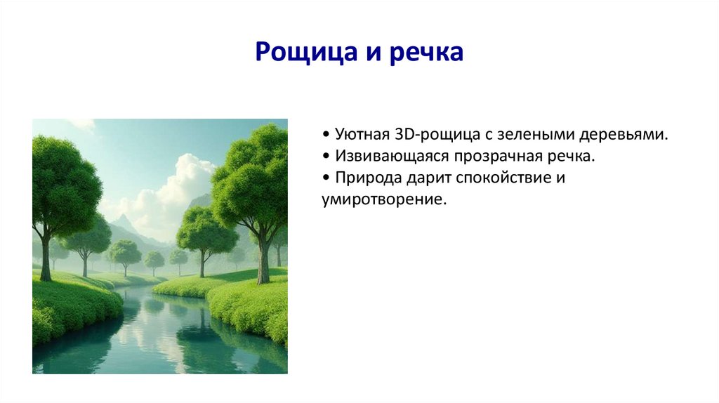 Рощица и речка• Уютная 3D-рощица с зелеными деревьями.