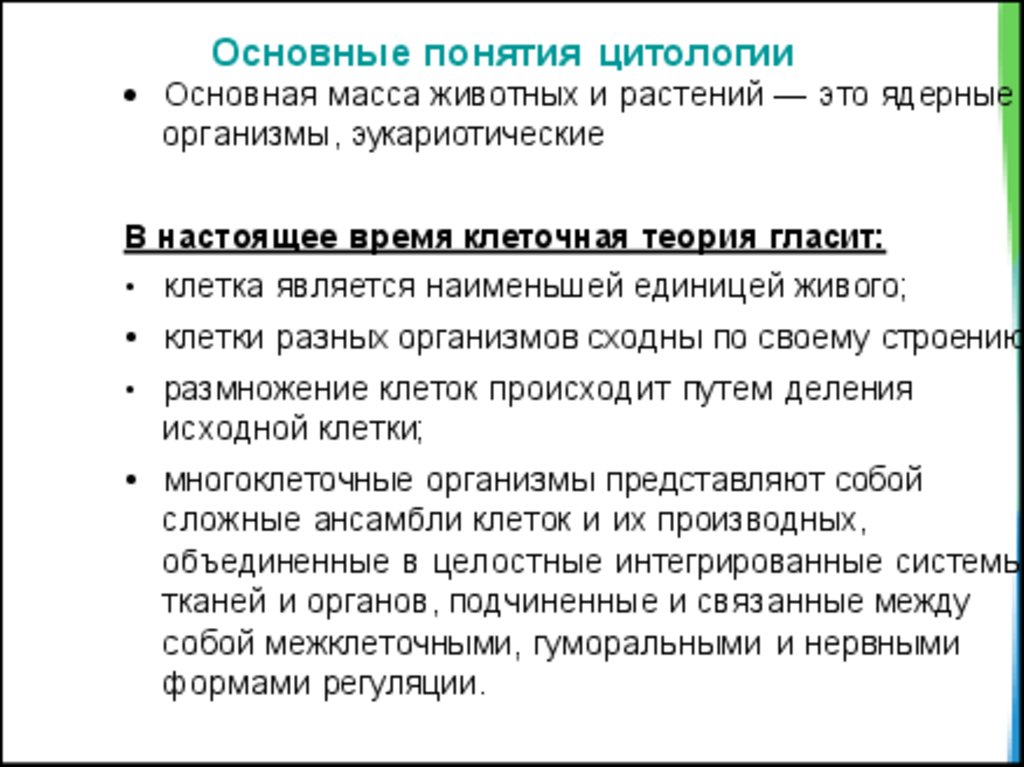Основные понятия цитологииОсновная масса животных и растений — это ядерные