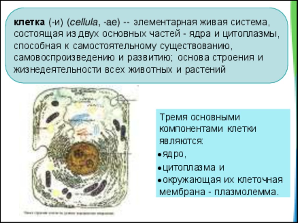 клетка (-и) (cellula, -ae) -- элементарная живая система,состоящая из двух основных частей - ядра и цитоплазмы,