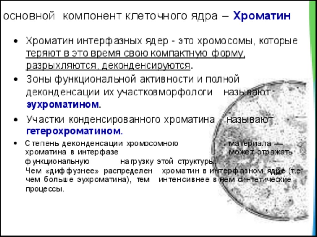 основной компонент клеточного ядра – ХроматинХроматин интерфазных ядер - это хромосомы, которые