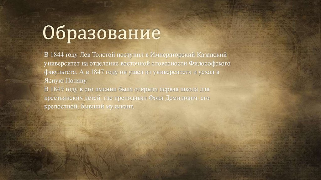 В 1844 году Лев Толстой поступил в Императорский Казанскийуниверситет на отделение восточной словесности Философского