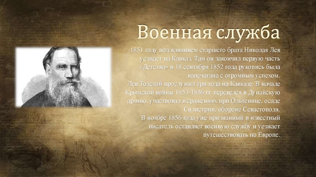1851 году под влиянием старшего брата Николая Левуезжает на Кавказ. Там он закончил первую часть