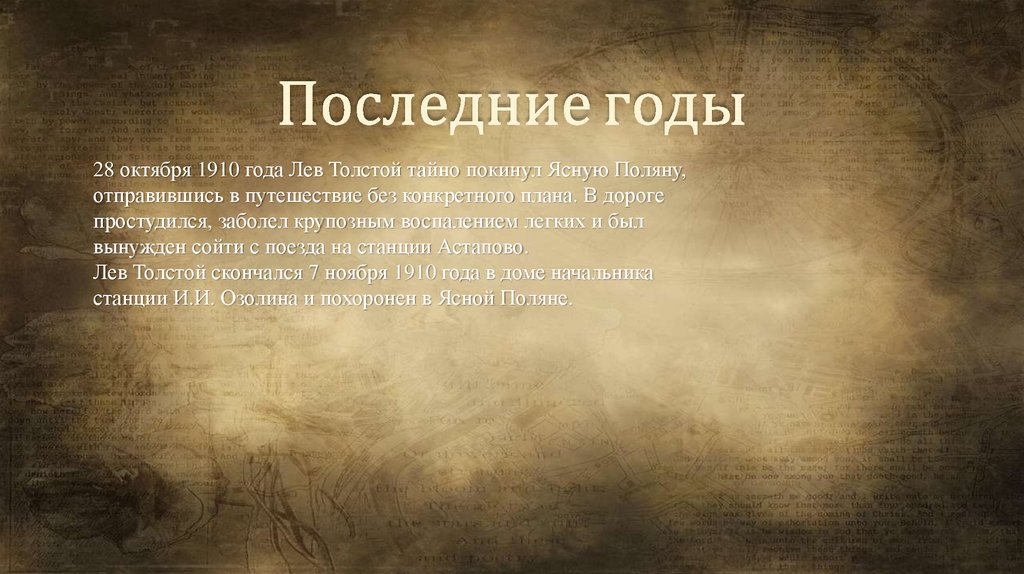 28 октября 1910 года Лев Толстой тайно покинул Ясную Поляну,отправившись в путешествие без конкретного плана. В дороге