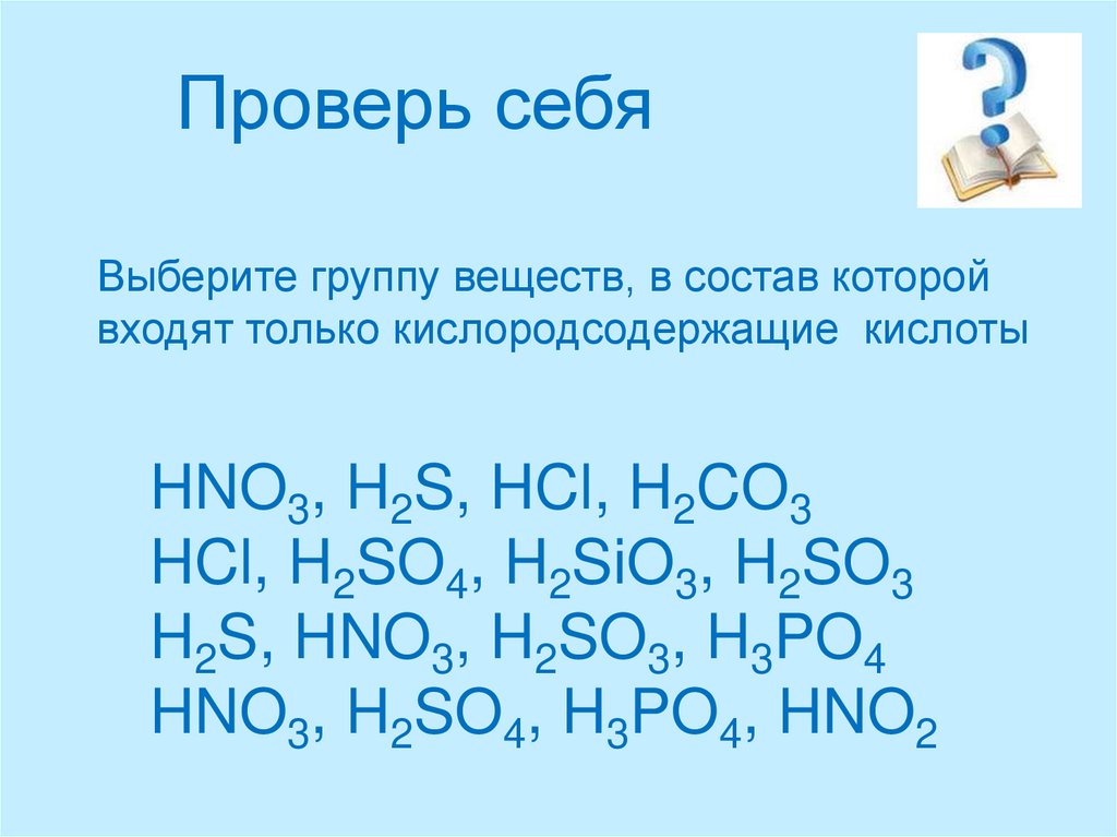 23. Проверь себя Выберите группу веществ, в состав которой входят только кислоты HCl, SO3, NaOH,CuCl2 HNO3, H2S, HCl, H3PO4 K2O,