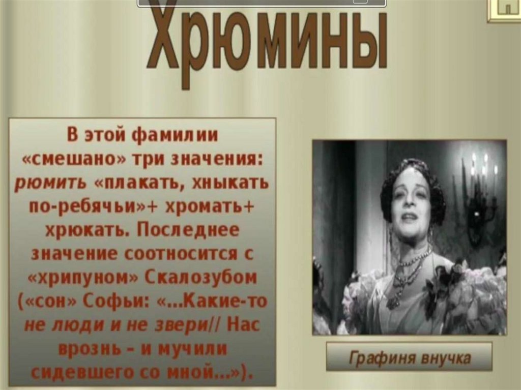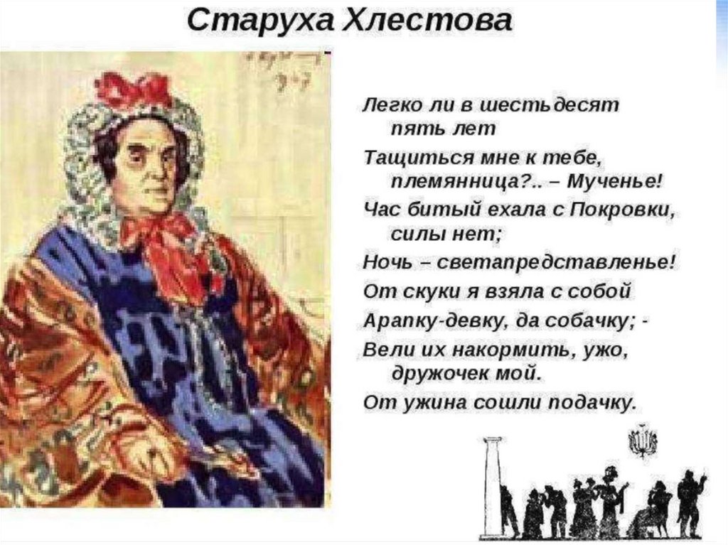 Властная и своенравная старуха Анфиса НиловнаХлестова, свояченица Фамусова, ярая крепостница,