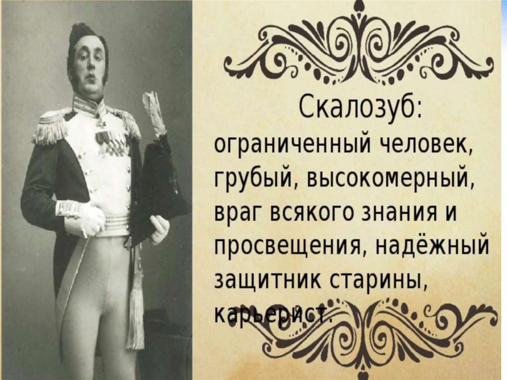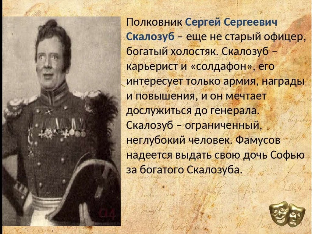 Он человек заметный — Сергей Сергеич Скалозуб… (действие III, явление 11).