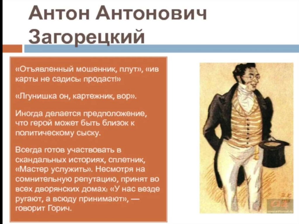 Загорецкий - бодрый и неунывающий пройдоха,услужливый и неутомимый, вхож в любые дома.