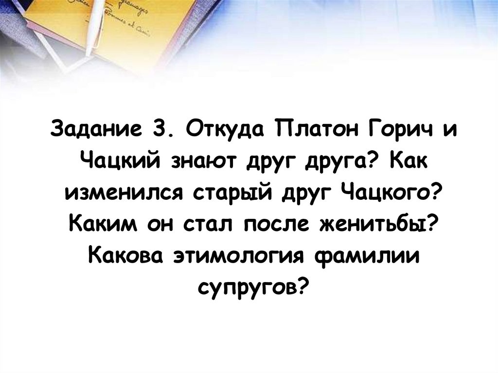 Задание 3. Откуда Платон Горич иЧацкий знают друг друга? Как