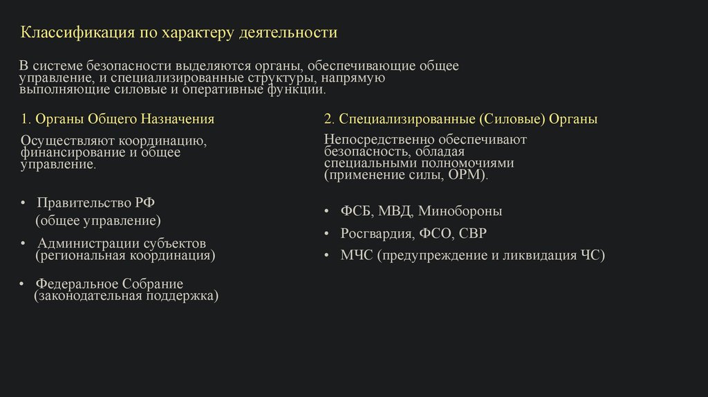 Классификация по характеру деятельностиВ системе безопасности выделяются органы, обеспечивающие общее