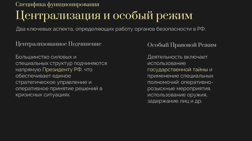 Специфика функционированияЦентрализация и особый режим