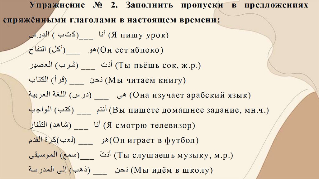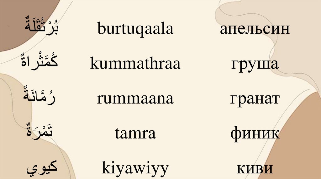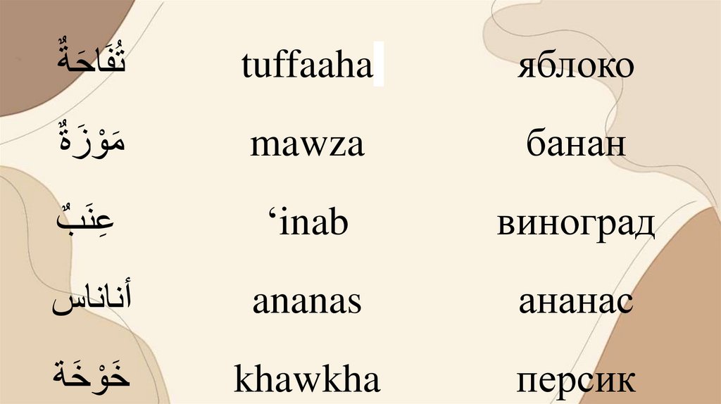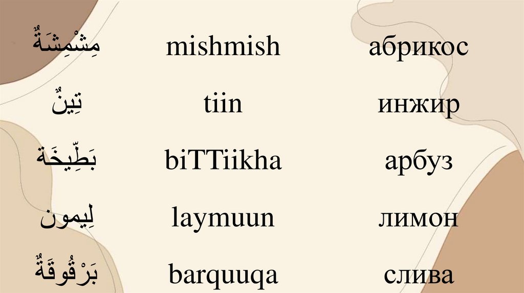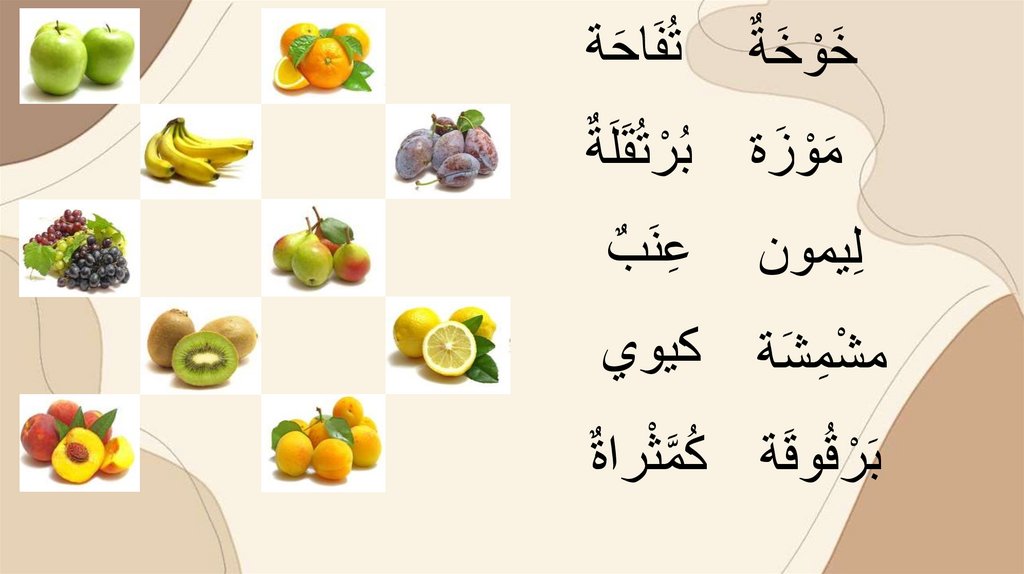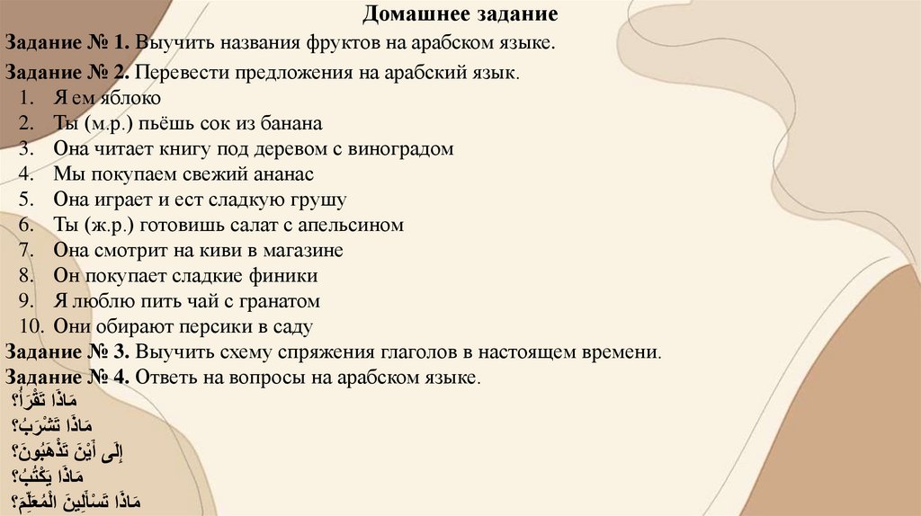 Домашнее заданиеЗадание № 1. Выучить названия фруктов на арабском языке.