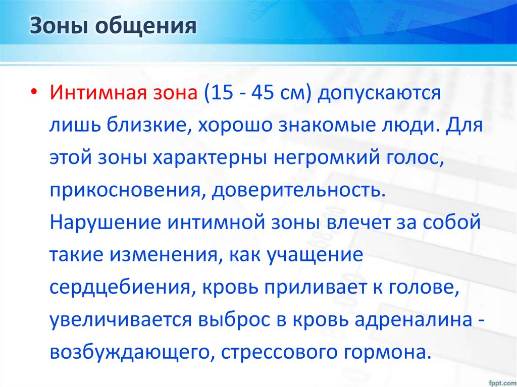 Зоны общения• Интимная зона (15 - 45 см) допускаются