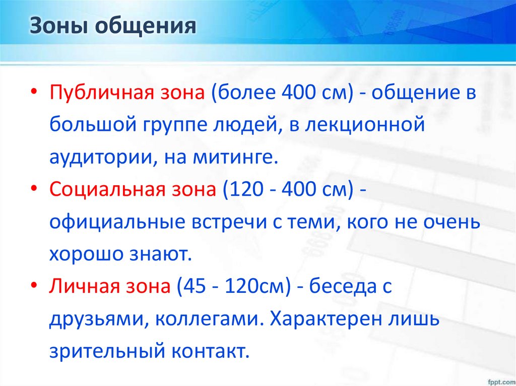 • Социальная зона (120 - 400 см) официальные встречи с теми, кого не очень