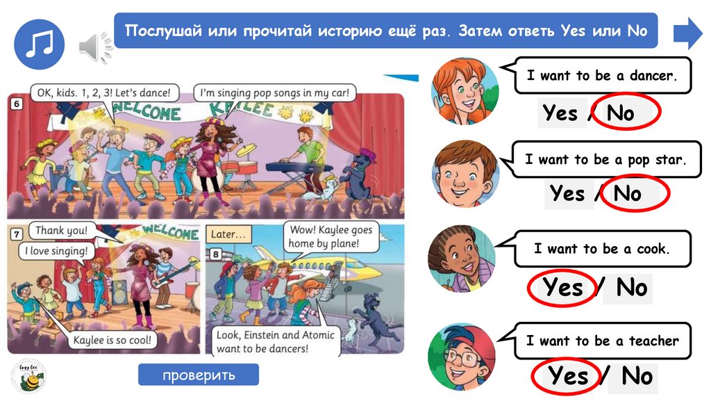 Послушай или прочитай историю ещё раз. Затем ответь Yes или NoI want to be a dancer.