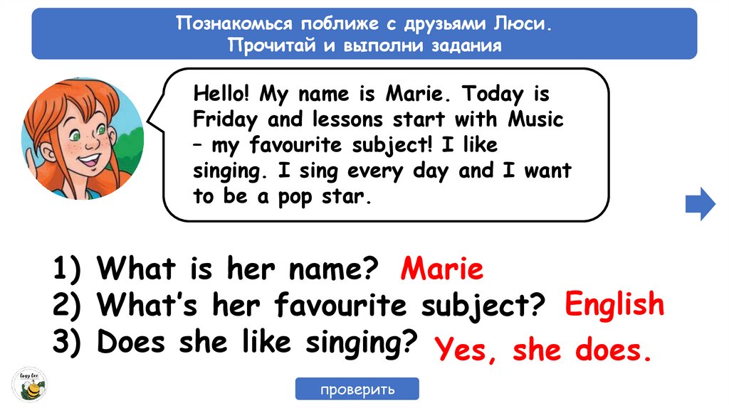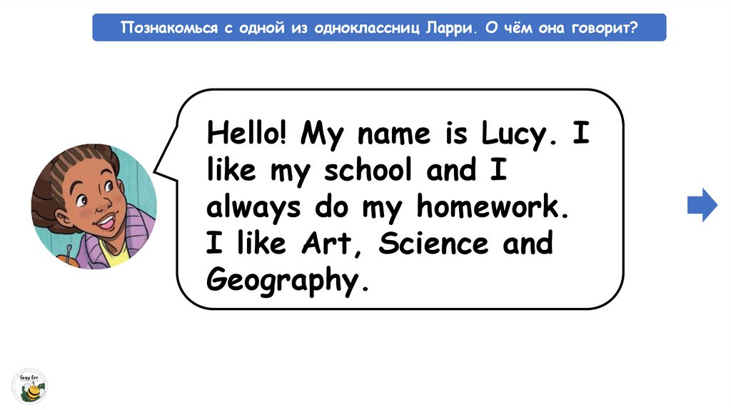 Познакомься с одной из одноклассниц Ларри. О чём она говорит?Hello! My name is Lucy. I
