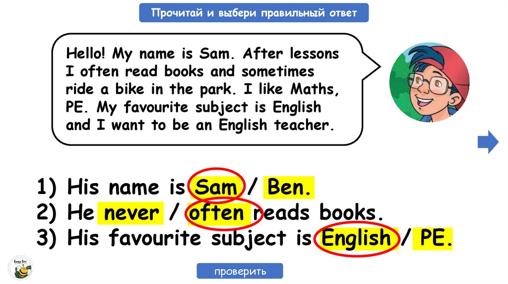 Прочитай и выбери правильный ответHello! My name is Sam. After lessons
