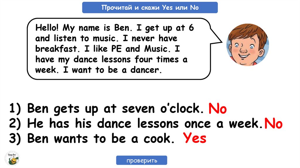 Прочитай и скажи Yes или NoHello! My name is Ben. I get up at 6
