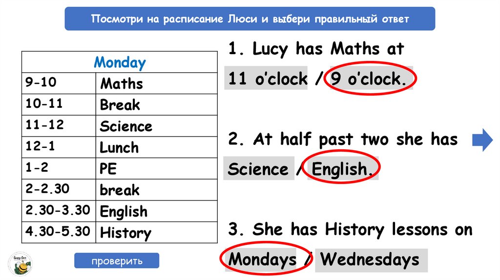 Посмотри на расписание Люси и выбери правильный ответMonday