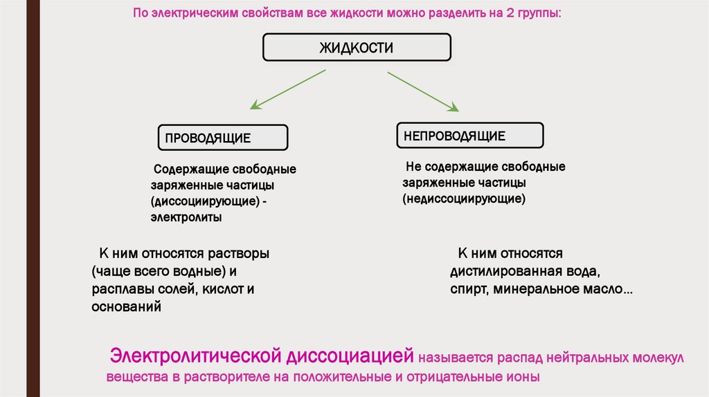 По электрическим свойствам все жидкости можно разделить на 2 группы:ЖИДКОСТИ