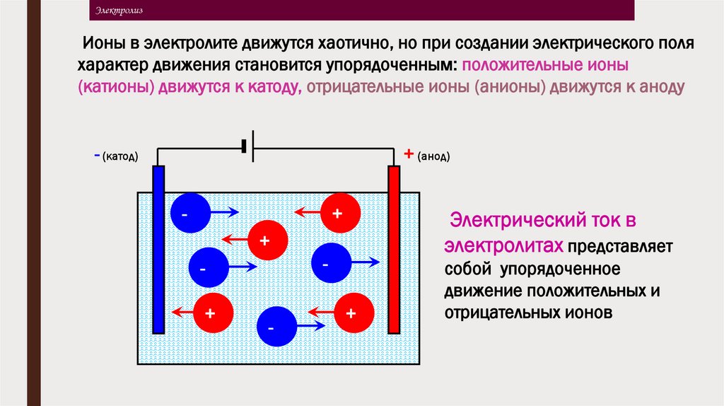 ЭлектролизИоны в электролите движутся хаотично, но при создании электрического поля