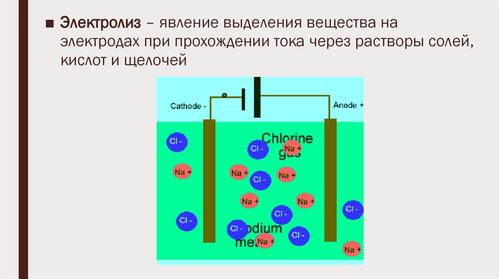 ■ Электролиз – явление выделения вещества наэлектродах при прохождении тока через растворы солей,