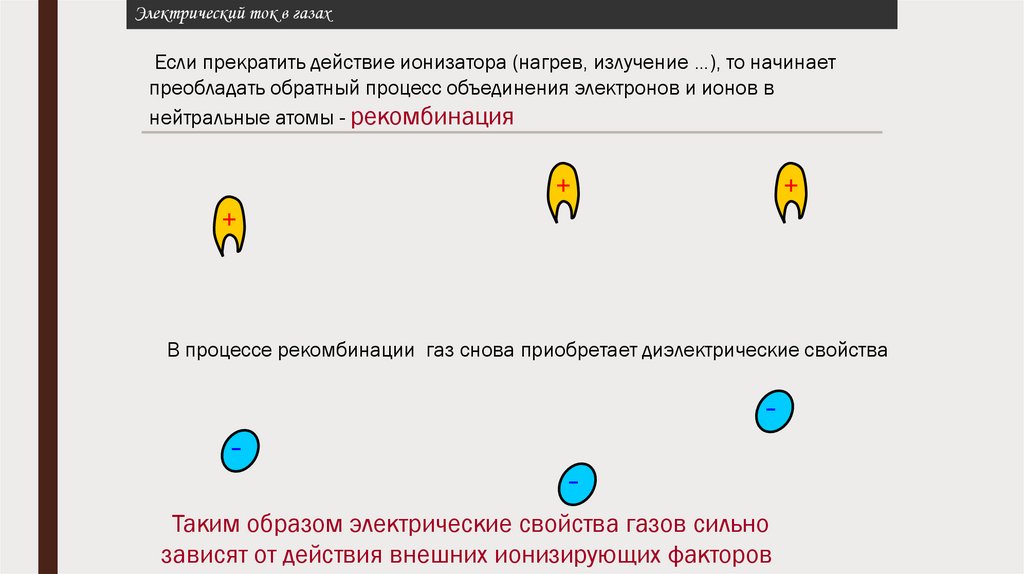 Электрический ток в газахЕсли прекратить действие ионизатора (нагрев, излучение …), то начинает
