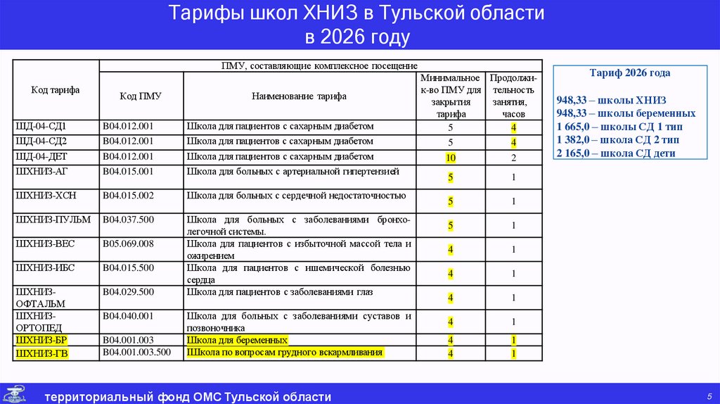 Тарифы школ ХНИЗ в Тульской областив 2026 году