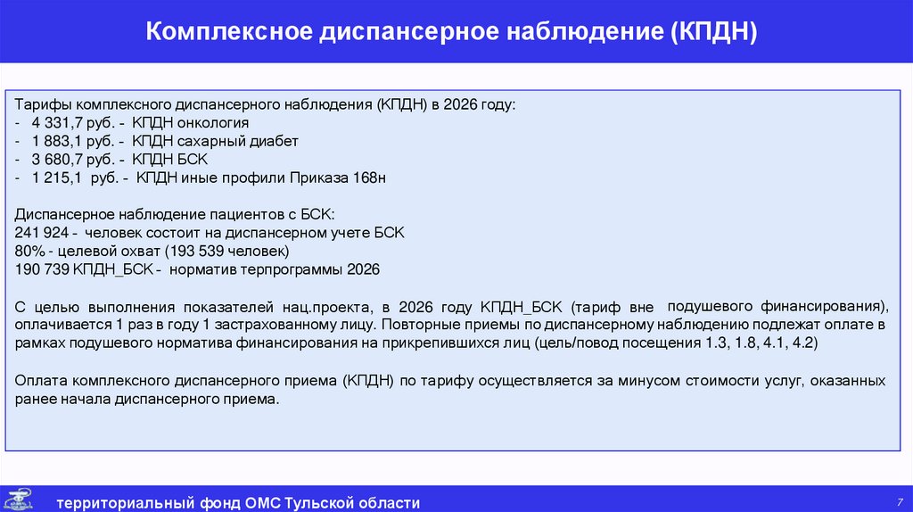 Оплата комплексного диспансерного приема (КПДН) по тарифу осуществляется за минусом стоимости услуг, оказанных