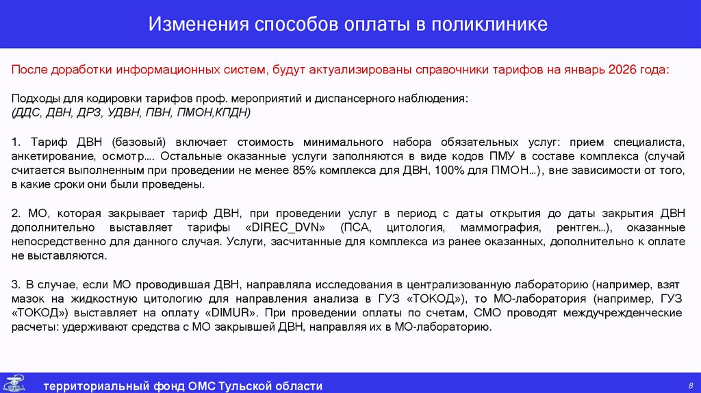 Изменения способов оплаты в поликлиникеПосле доработки информационных систем, будут актуализированы справочники тарифов на январь 2026 года: